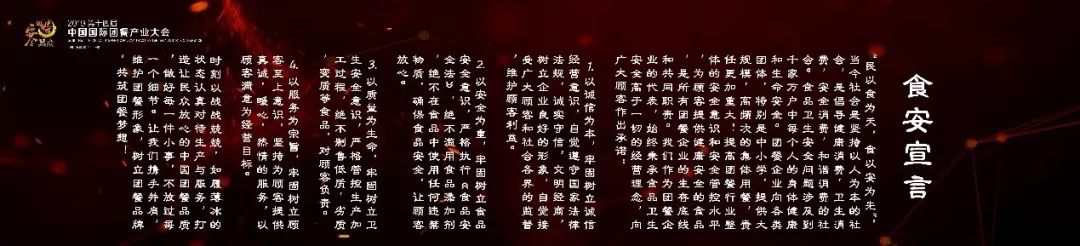 食品安全问题近年来受到了全社会的广泛关注,保证食品安全是餐饮企业的底线和生命线。此次大会,刘延云董事长领读了食安宣言,宣言内容如下: