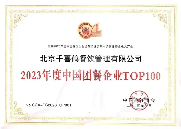 千喜鹤集团作为中国团餐行业影响力品牌,连续多年被中国烹饪协会授予中国团餐百强企业、中国餐饮业十大品牌企业、中国十大团餐品牌企业等荣誉称号。